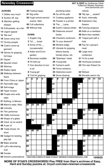Because free access to the content of Newsday.com is available only to Newsday subscribers and customers of Cablevision (Newsday’s owner), many thousands of puzzle fans, spanning six continents, get the Newsday Crossword free every day right here at Stan’s Crossword Land.